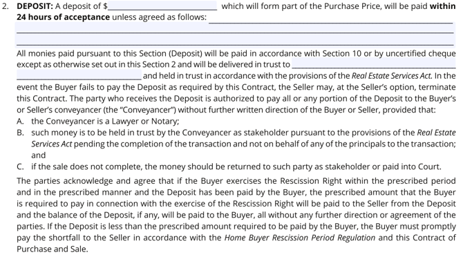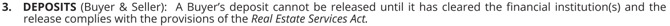 This section explains what happens to a deposit during the course of a transaction. Deposits must be held by the brokerage as a stakeholder, not on behalf of one party. This is an important point, as it means that the deposit is being held on behalf of both parties in order to facilitate the transaction. Release of deposits requires written agreement by both parties or, failing that, a court order.