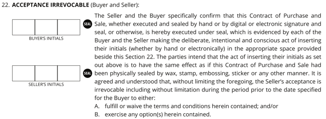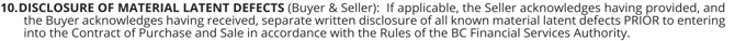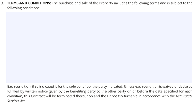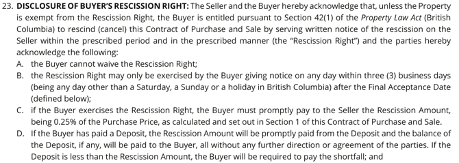 This section is relatively straightforward. The CPS becomes legally binding once signed by both parties. However, the key point you want to recognize and explain to clients is that under Section 42 of the Property Law Act, buyers of residential real property have the right of rescission within the prescribed period. During that time, the buyer can cancel the contract, subject to payment of the rescission fee.