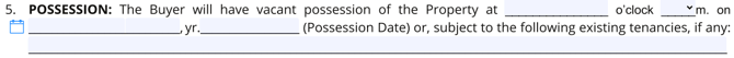 This clause outlines the possession process, and tenancy considerations. Possession occurs at the time stated in the CPS. If tenants are present, their rights must be respected under the Residential Tenancy Act.