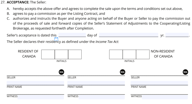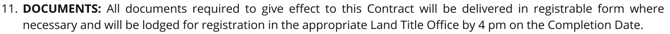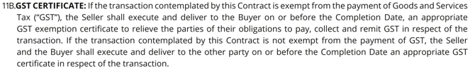 This clause outlines the closing matters set out in sections 11, 11A, and 11B of the contract. These sections detail the documents and confirmations required to make the agreement binding. They include particulars about the seller, such as residency status (important for tax compliance) and whether GST applies to the property. The preparation and exchange of these documents are typically coordinated by the buyer’s lawyer or notary and reviewed by the seller’s legal representative to ensure the transaction closes smoothly and in compliance with legal requirements.