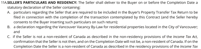 This clause simply states that the buyer and seller should seek legal advice in regards to their residency and citizenship status. There are certain tax implications to be aware of, specifically, there is the foreign buyer's tax, vacancy and speculation tax among other things.