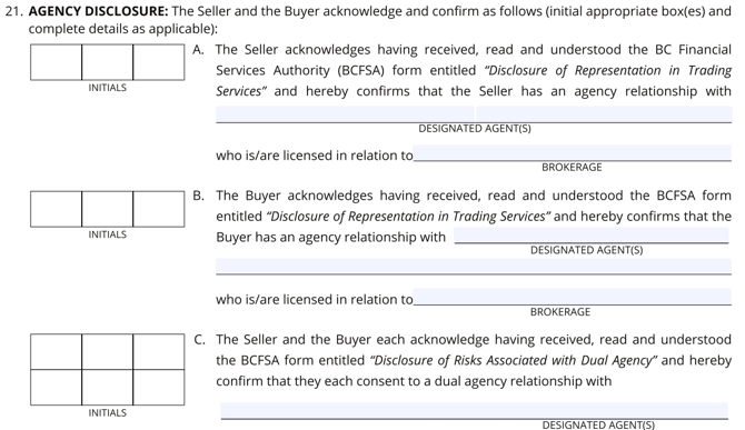 This clause specifies that a REALTOR® must disclose if they have a personal interest in a property transaction. Disclosure is made through the Disclosure of Interest in Trade form and is mandatory in any of the following situations: