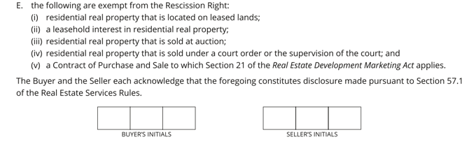 This section explains the Home Buyer Rescission right, outlining when it can be exercised and identifying the exemptions that may apply. It also serves as a signed disclosure, confirming that both parties understand their rights and obligations under the rescission period.