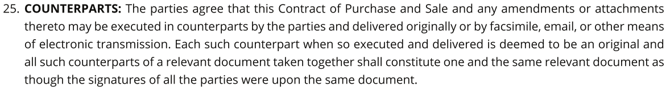 This section relates to how the contract may be signed and delivered. It allows each party to sign separate copies, which can be exchanged electronically by fax, email, or other means. Each signed copy is treated as an original, and together they form one binding contract as though all parties had signed the same document.