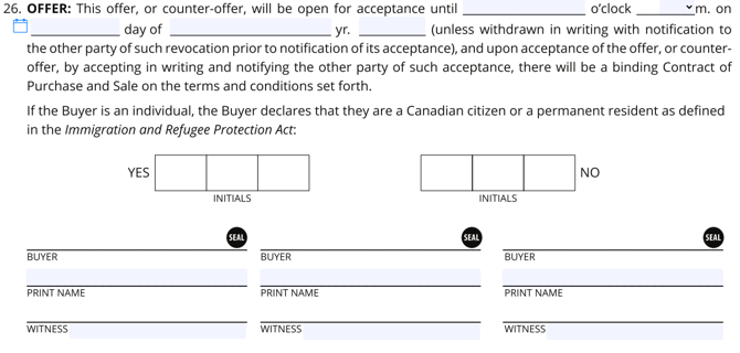 This section relates to the timeline for acceptance of the offer. It clarifies that a buyer may rescind their offer at any time before acceptance, and that sufficient time should be allowed for the seller to review and respond. While it is customary for sellers to reply, they are under no legal obligation to do so. Importantly, buyers and agents cannot rely on verbal acceptance, as it can be revoked—written acceptance must be received before the deadline. If the acceptance period expires without a signed response, the offer is no longer valid and must be resubmitted.