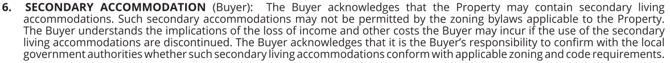This section relates to secondary suites. Buyers should understand that most suites are not legally authorized, even if the zoning allows them. Many municipalities enforce bylaws on a complaint basis, with traffic and noise being the most common triggers. However, there is no guarantee that the continued use of an illegal suite will be permitted, and buyers should be cautious when relying on rental income from such units.