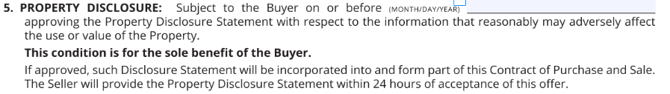 This section relates to the Property Disclosure Statement (PDS). Buyers should review the PDS carefully, as once it is incorporated into the Contract of Purchase and Sale, the seller’s statements can become binding warranties. This means inaccurate or misleading disclosures may give rise to contractual remedies.