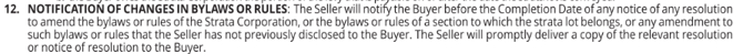 The seller must notify the buyer of any new bylaws or rules passed between acceptance and completion. This ensures the buyer is fully informed of changes that may affect their ownership. In some cases, the buyer may negotiate to receive proxy voting rights for meetings held before completion.