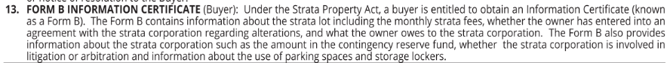 This clause requires the seller to provide the buyer with a Form B Certificate, which discloses important details about the unit and strata corporation, including:
