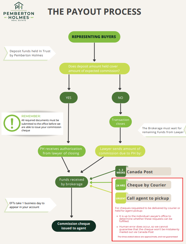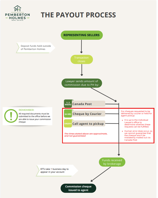 When representing the seller, the lawyer typically holds the deposit funds until completion. After closing, the lawyer sends the commission payment directly to Pemberton Holmes. Once those funds are received, your commission cheque is prepared and released.