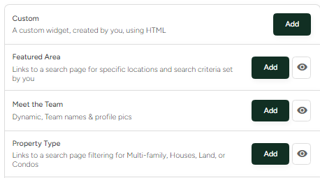 Widgets are content blocks (snippets of HTML) that display on your homepage. They contain text, images or links that send users to other sections of your website! They can be a great way to add a professional image and make your website stand out from others.