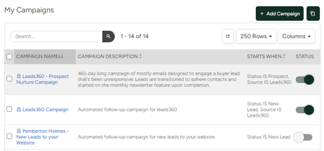 Status Toggle – Located on the far right, this switch controls whether the campaign is active. Green means it's ON; grey means it's OFF. A campaign must be turned ON to apply it to contacts.