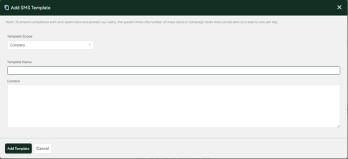 (2) Creating an SMS Template: SMS templates allow BoldTrail to send automated text messages. They are limited to 220 characters (excluding signature and opt-out text) and can only be sent once per lead per day, with campaign texts spaced 24 hours apart.
